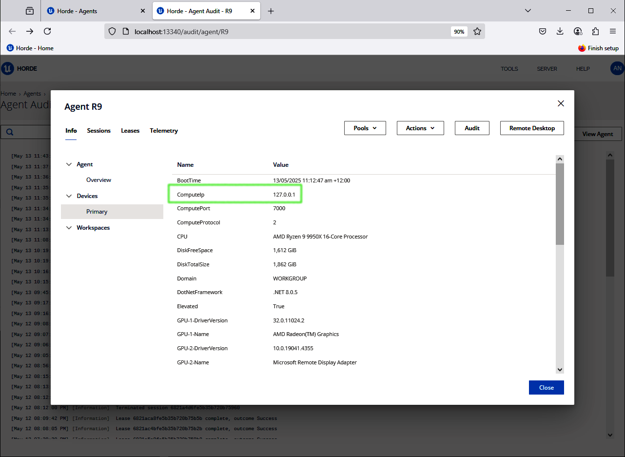 This problem can be confirmed by looking at the Horde server web interface. If you select Server | Agents from the menu, right click the agent in the agent list and select "Audit", then in the Agent Audit screen click "View Agent" on the right you see this screen: