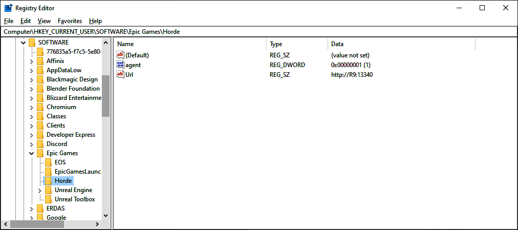 On an Agent machine, the address of the Horde server is stored in the registry: