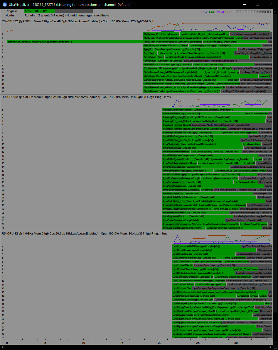 This will build the project using both machines. After a few seconds the UBA Visualizer window will appear showing files being compiled on each machine like this: