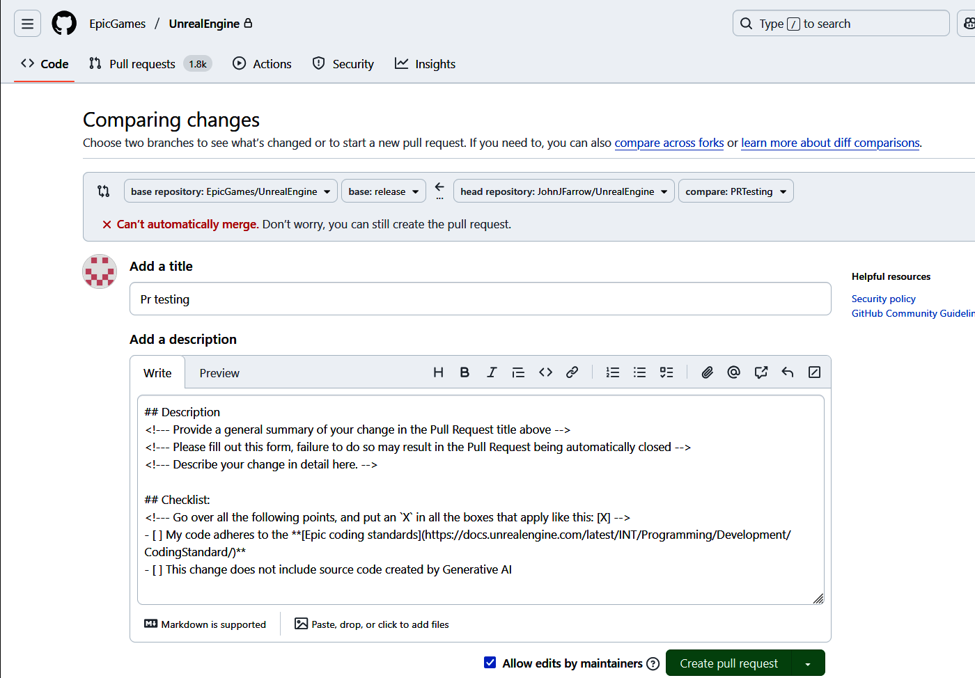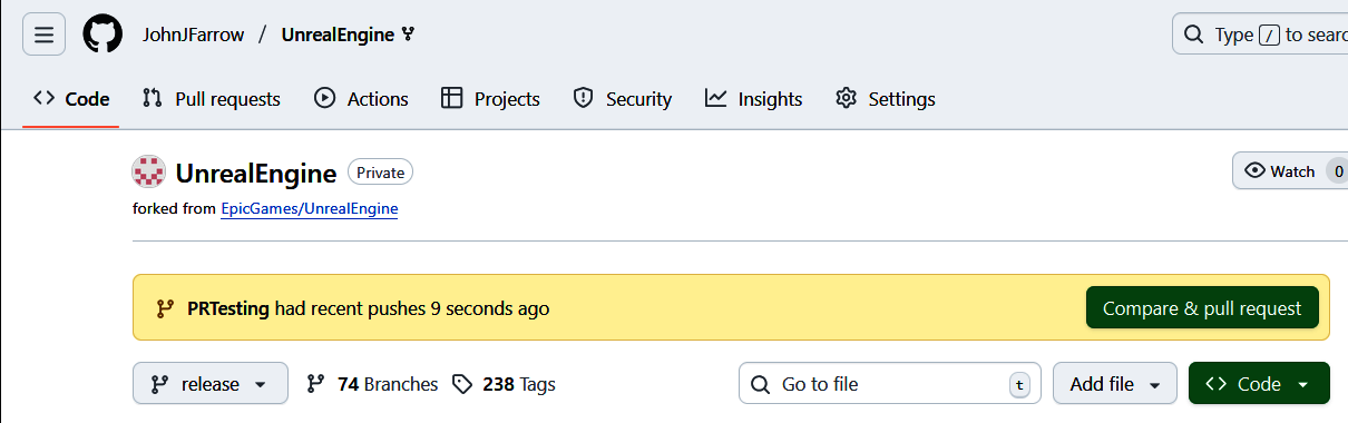 This is a commit on my repository, not the Epic Games once. Creating a pull request is the mechanism to (or attempt to) merge this commit into the Epic Games repository.