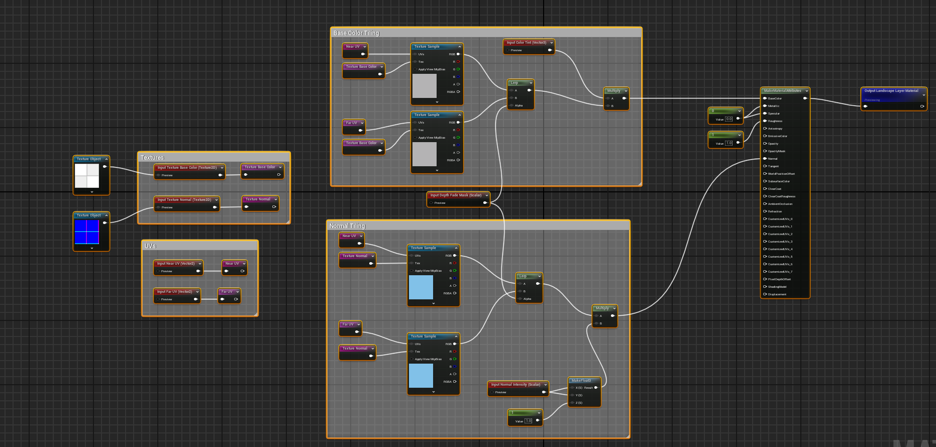 As shown above there also needs to be a parameter controlling the distance at which the blending occurs, i.e. where does near change to far. Having two tiling sizes make the landscape look better but sampling the textures twice has a performance overhead.