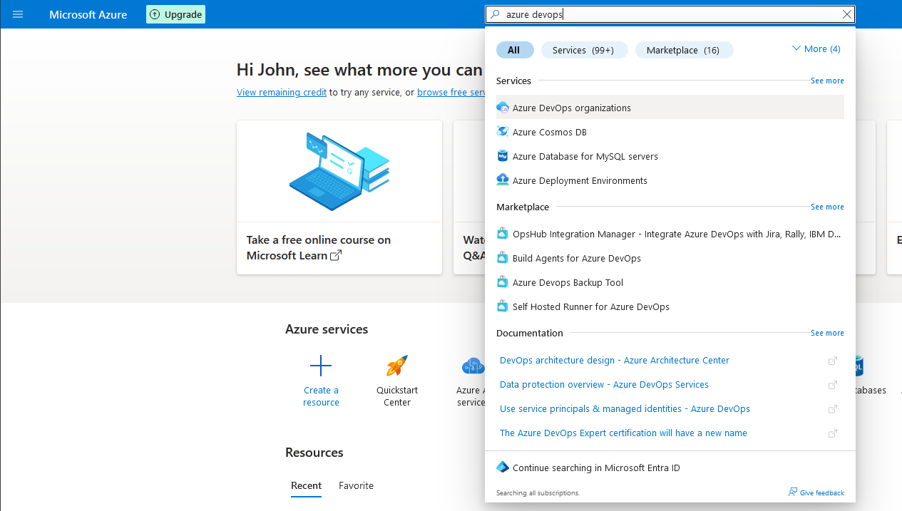 Open the Azure portal and in the top search bar type "azure devops" like so: